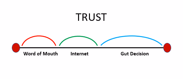 With the advent of the internet, social networks, and rating systems, another element was added to close the trust gap. But information found on the internet could possibly be false, overhyped, or not fact-checked, not validated. Ratings seem helpful, but people realize ratings can be manipulated. Four and half Yelp stars could be because the dentist’s friends and family were prompted to give a high rating. Nevertheless, with social networks and rating data, it does help close the trust gap. But knowing the information could be dishonest or manipulated to try to produce a certain image of the dentist still left a large trust gap (Figure B).