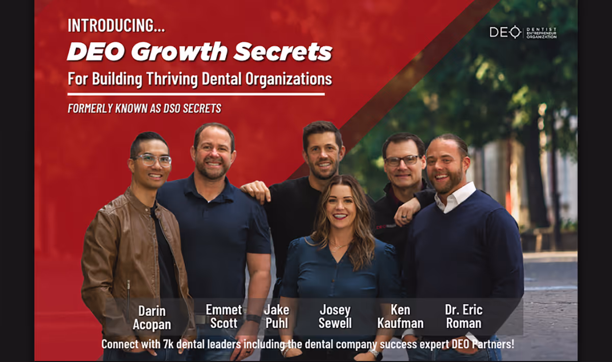 DEO Partners regularly share expert tips and real-time advice culled from their combined 60+ years of experience in the dental industry. Join to connect with Jacob Puhl, Partner & CEO of the DEO; Darin Acopan, DEO Partner & EVP of Sales; Dr. Eric J. Roman, DEO Partner; Josey Sewell, RDH, DEO Partner & Head of Implementation & Coaching; Emmet Scott, co-founder of Community Dental Partners (CDP) & DEO Partner; and Ken Kaufman, President/CFO of Nuvia Dental Implant Centers & DEO Partner.