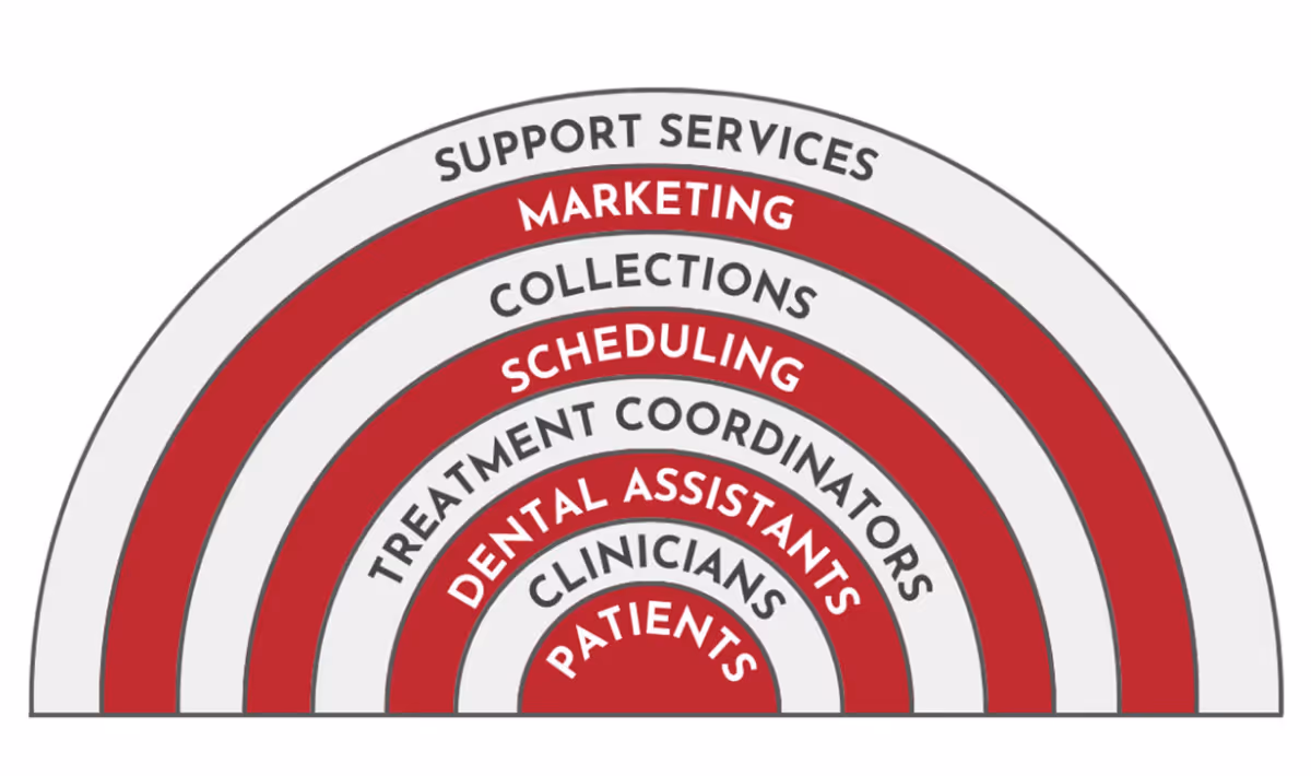 Think of the customer stack as a ranking of priority levels from highest to lowest: patients, clinicians, dental assistants, treatment coordinators, scheduling, collections, marketing, and support services.
