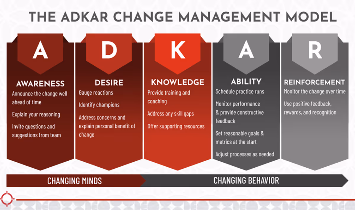 The ADKAR change management model is a powerful framework that helps office managers navigate the process of implementing critical systems in their practice. ADKAR stands for Awareness, Desire, Knowledge, Ability, and Reinforcement - the five stages necessary for successful change. Lets delve into each stage in detail.