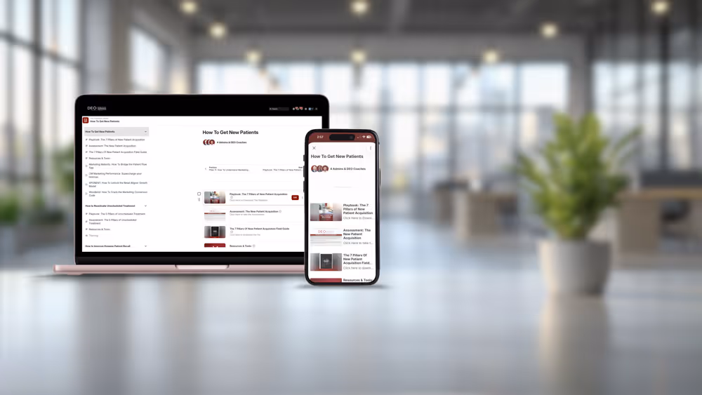 The DEO's core goal is 50% more profit and 50% less work within 12 to 24 months. This is backed by The DEO 5X Return commitment that every member earns back at least five times their coaching investment. At the Entrepreneur Growth stage the first measurable results typically come from financial clarity and case acceptance improvement — both of which can produce significant impact within the first 90 days. The deeper operational and leadership improvements compound over time as the coaching relationship deepens and the systems take hold across every location.